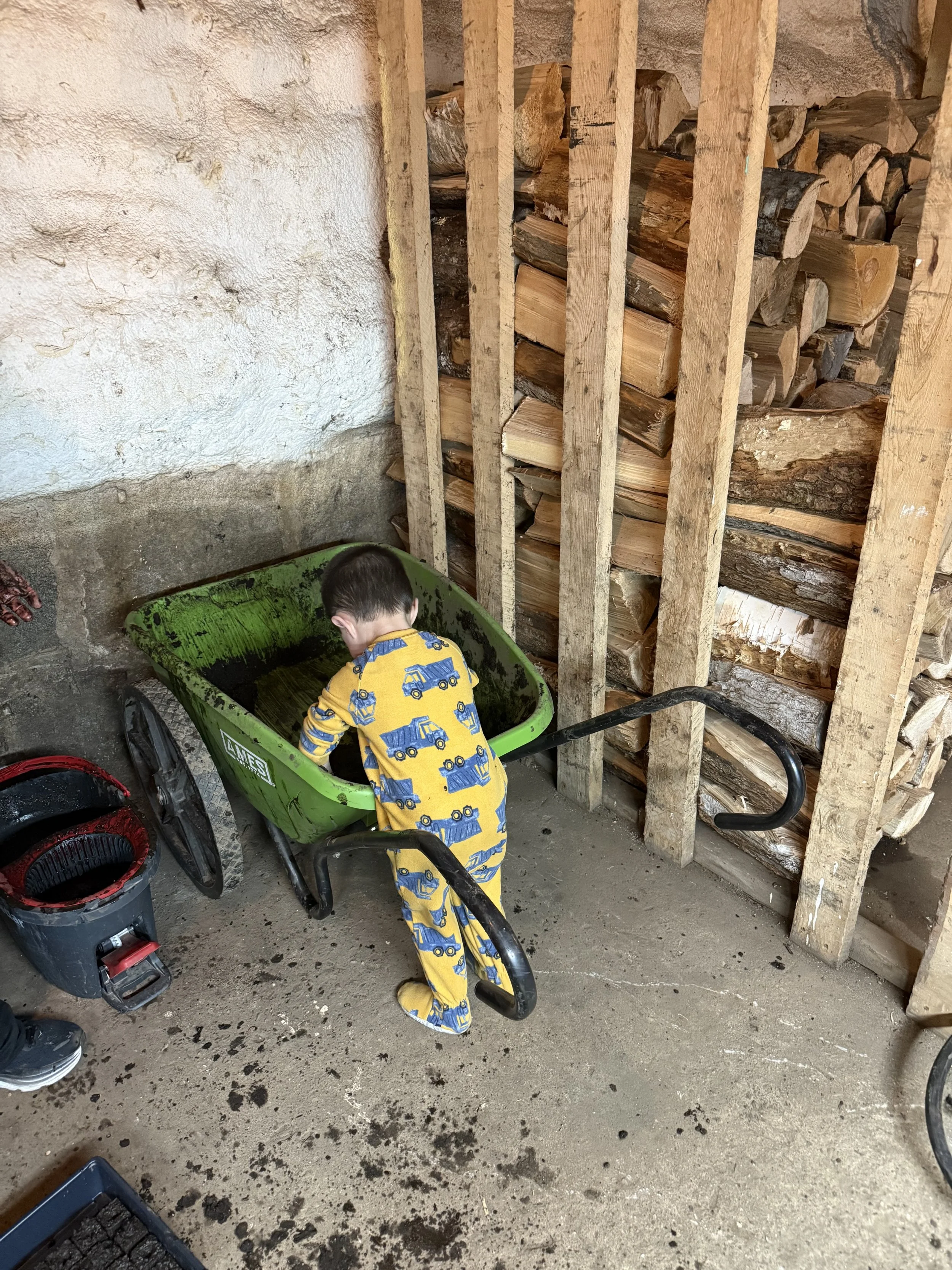 Getting help from our littlest farmhands, Kortez and Kodiak, who have been hard at work hauling small tools, inspecting worm piles, and occasionally turning the compost pile into a mud kitchen